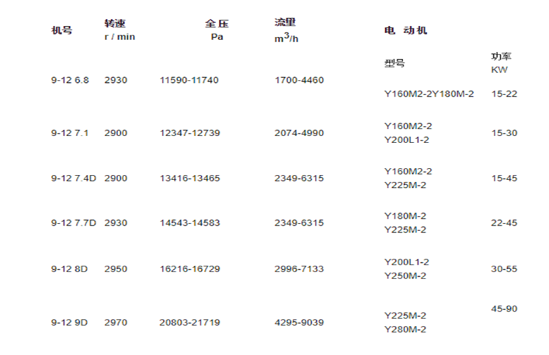 1).9-12型高壓離心通風(fēng)機均為單吸入,9-12型高壓離心風(fēng)機我公司設(shè)計機號有№ 6.8A、7.1A、7.4D、7.7A、8D、9D六個機號。