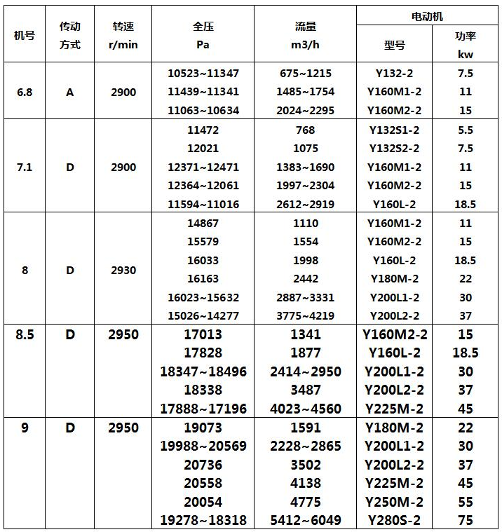 8-09型高壓離心通風機是與熔化率為1、2、3、5、7t/h化鐵爐配套的專用風機,也可以作為各種熔爐、鍛冶爐鼓風和輸送空氣及無腐蝕性、不自燃、不含粘性物質之氣體,其它性能相近者亦可選用,但輸送介質的溫度不得超過80℃,介質中所含塵土及硬質顆粒物不大于150mg/m3。